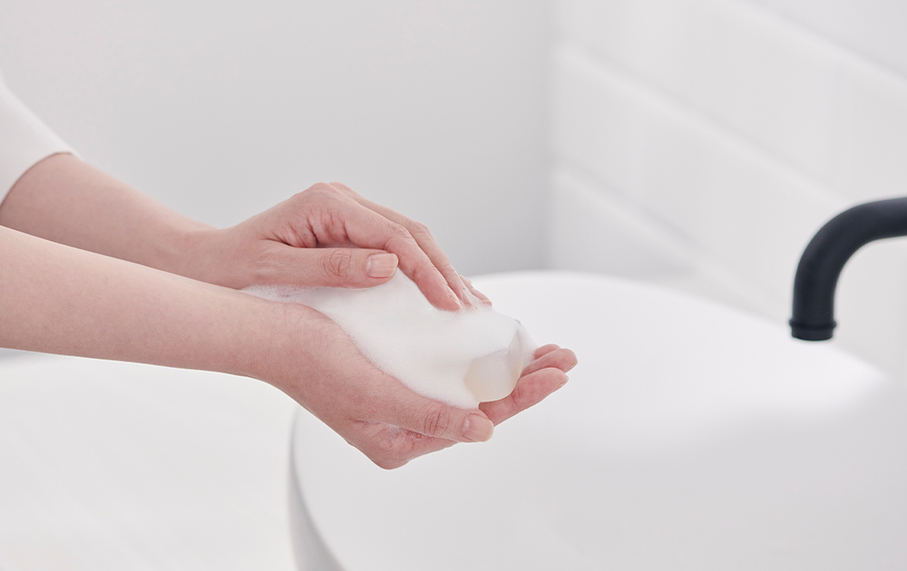まずは、メイクブラシが⼊るサイズの容器と、⽯けんや中性洗剤などをご⽤意ください。容器に適量の⽔を⼊れたら、⽯けんや中性洗剤を⼿に取り、⽔を加えて⼿のひらの上で泡⽴てましょう。この際、泡⽴てネットで泡を作るのがおすすめです。