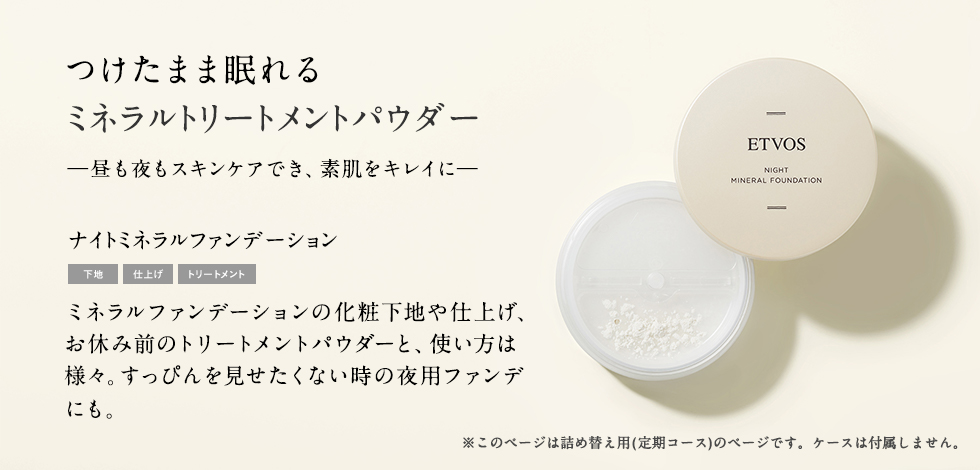 ミネラルファンデーションの化粧下地や仕上げ、お休み前のトリートメントパウダーと、使い方は様々。すっぴんを見せたくない時の夜用ファンデにも。