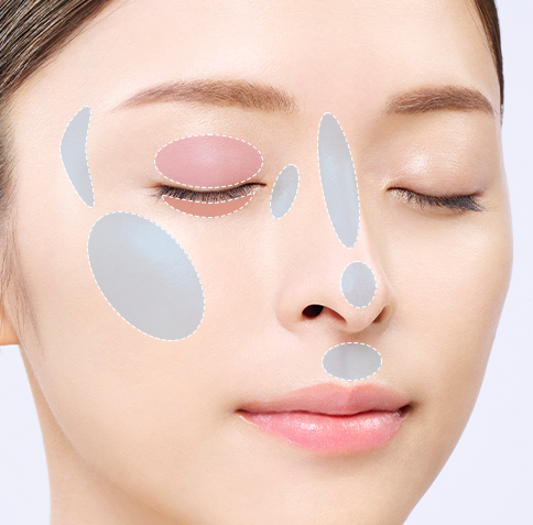 ツヤを出したい頬の高い位置やおでこ、目頭、目周りのCゾーン、鼻筋などの部分にやさしくなでるように塗布します。