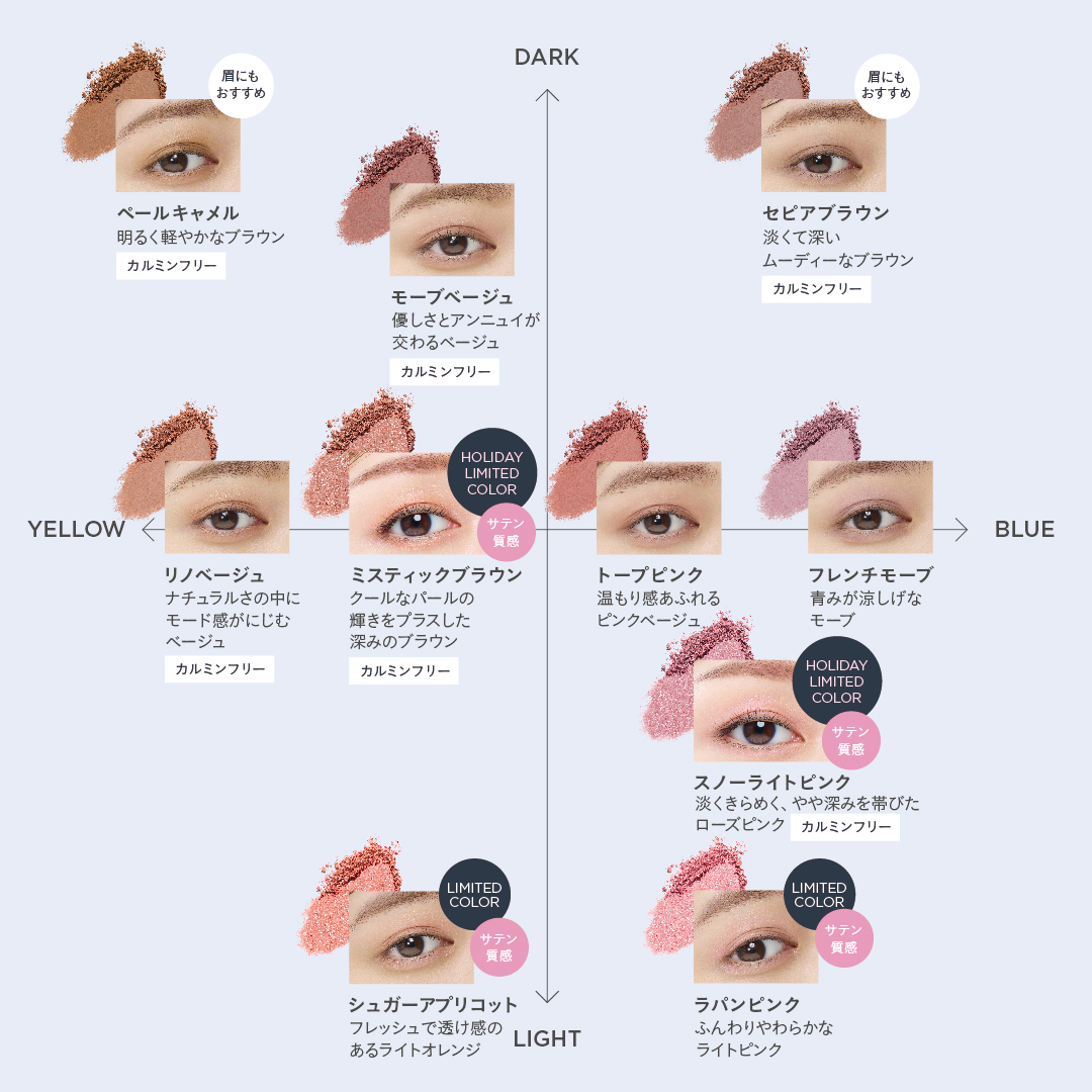 皮脂を含んでも変色しにくい精製度の高いマイカ (天然の鉱物)を使用。時間がたってもくすみにくく発色の美しさをキープ。