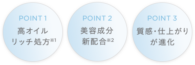 進化した高オイルリッチ処方※1に加え、マルチ使用ニーズに応えた新美容成分※2も配合。また仕上がりの美しさも一層高まりました。