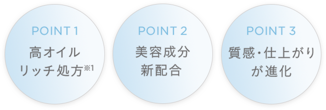 進化した高オイルリッチ処方※1に加え、マルチ使用ニーズに応えた新美容成分※2も配合。また仕上がりの美しさも一層高まりました。