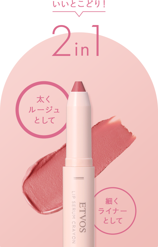 2in1スリムクレヨン形状心地よく唇の上でのび広がり、セミマットな質感で彩る直径6.5mm細芯で繰り出し式のリップクレヨン。