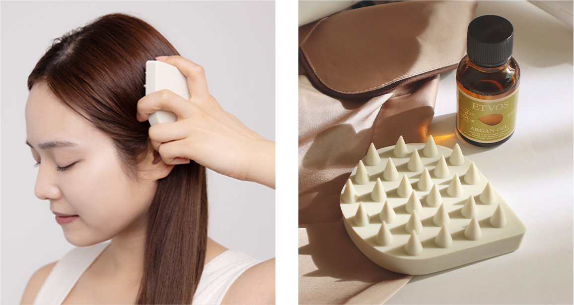 アウトバスでもインバスでも使え、頭皮のツボを心地よく刺激できるマッサージブラシ。