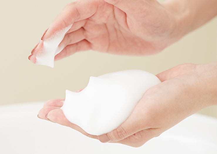 石けんもしくは洗顔フォーム適量(2㎝程度)を手のひらにとり、ぬるま湯を数回に分けて加えながらキメ細やかな泡をたっぷり立てる。