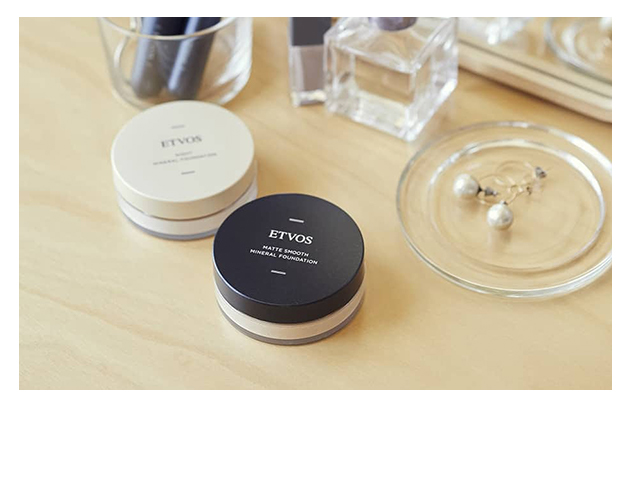 ETVOSのベースメイクは、化粧ノリをアップし、崩れ防止にもなる「ナイトミネラルファンデーション」をつけて肌表面を整え(化粧下地)、「マットスムースミネラルファンデーション」を使う2段階が基本。
