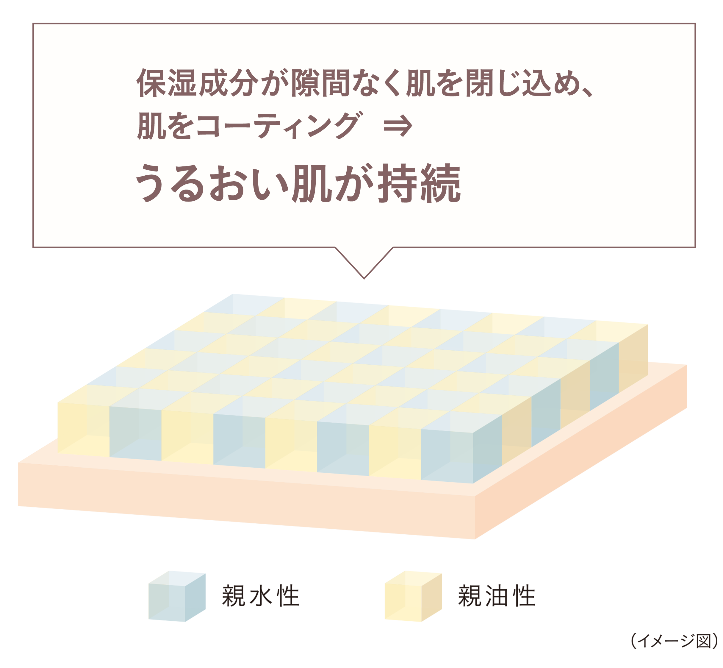 水になじみのよい保湿成分と、油になじみのよい保湿成分という異なる性質の成分が互いに安定して肌をコーティング。