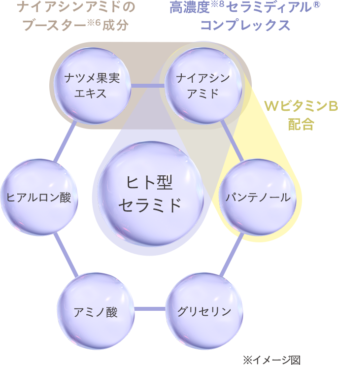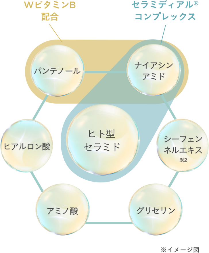 肌との親和性が高い「ヒト型セラミド※2」、肌のハリ感をサポートするビタミンB3の一種「ナイアシンアミド※3」、肌のうるおいを保つ「ヒアルロン酸※4」、保湿成分「パンテノール」「アミノ酸」、「グリセリン」など、美肌の9要素※1にアプローチする、美容成分を複合的に配合。