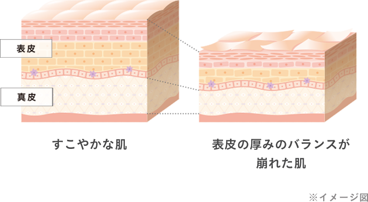 非薄化とは加齢により肌全体の厚みが薄くなってしまう現象。皮膚の最も外側にある「表皮」の菲薄化は、